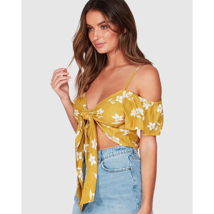 A fresh floral blooms all over a fluttery crop top with cold-shoulder short sleeves and a fully adjustable tie at the front. This piece is part of a collaboration with Julie Sariñana, influencer and founder of the popular fashion and lifestyle blog, Sincerely Jules. The collection uses beautiful colors, silhouettes and textiles to reflect Julie’s timeless mantra: dream, believe, achieve.