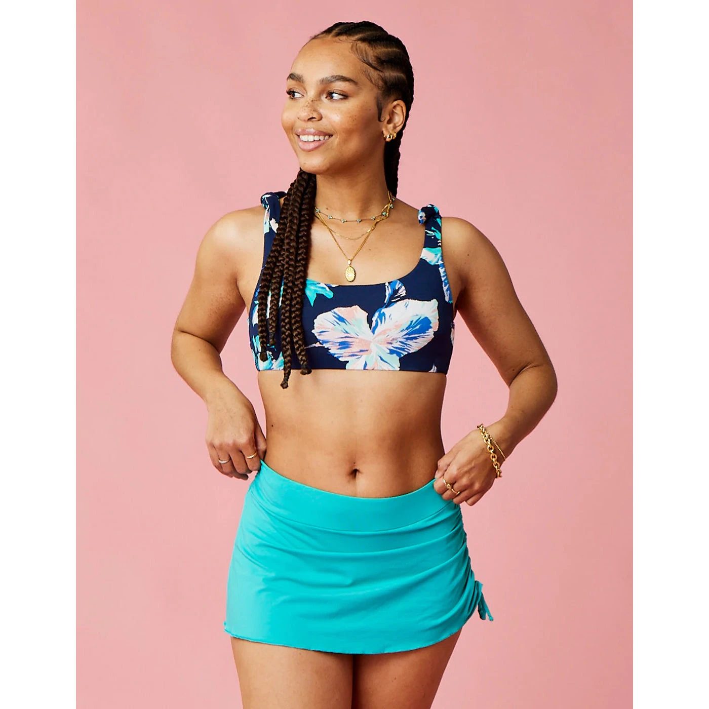 For a little more coverage with a feminine, flirty feel, the Hoku Swim Skirt was constructed with a built in bikini bottom, ruching at waist, and a cinchable side tie for an adjustable hem length. Keeps your rear covered, lets your playful spirit shine.