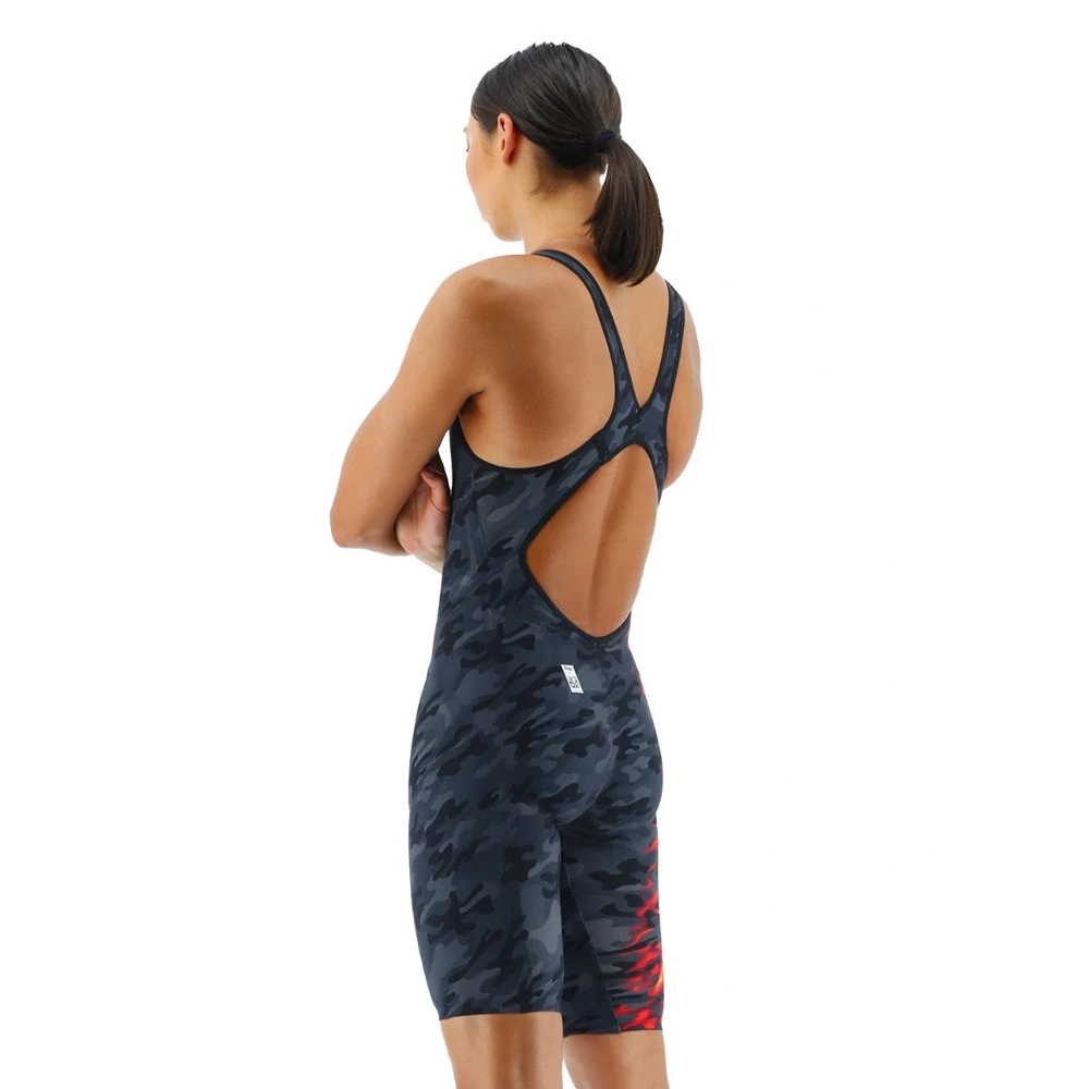 As the first and only technical suit in the industry to analyze drag from a microscopic perspective, the TYR Women’s Venzo Camo Fire Open Back Swimsuit utilizes ultra smooth fiber to thread a frictionless, durable fabric. Designed with state-of-the-art Surface Lift Technology, the Venzo prevents water from permeating its fabric, resulting in higher body position in the water.